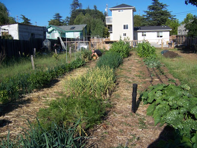 When we bought the lot there were several very pooly maintained fruit trees, overgrown vinca, a large row of artichokes, lots of junk and our own colony of yellow jackets. We removed the yellow jackets by force, and basically tore out all the trees and overgrown plants except for a small citrus tree (seen above on the right) and the artichokes. It looked really bad but we thought maybe we could save it. I don’t feel bad for tearing out the trees since we replaced the half dozen we took out with 24 new fruit trees and 2 olive trees.