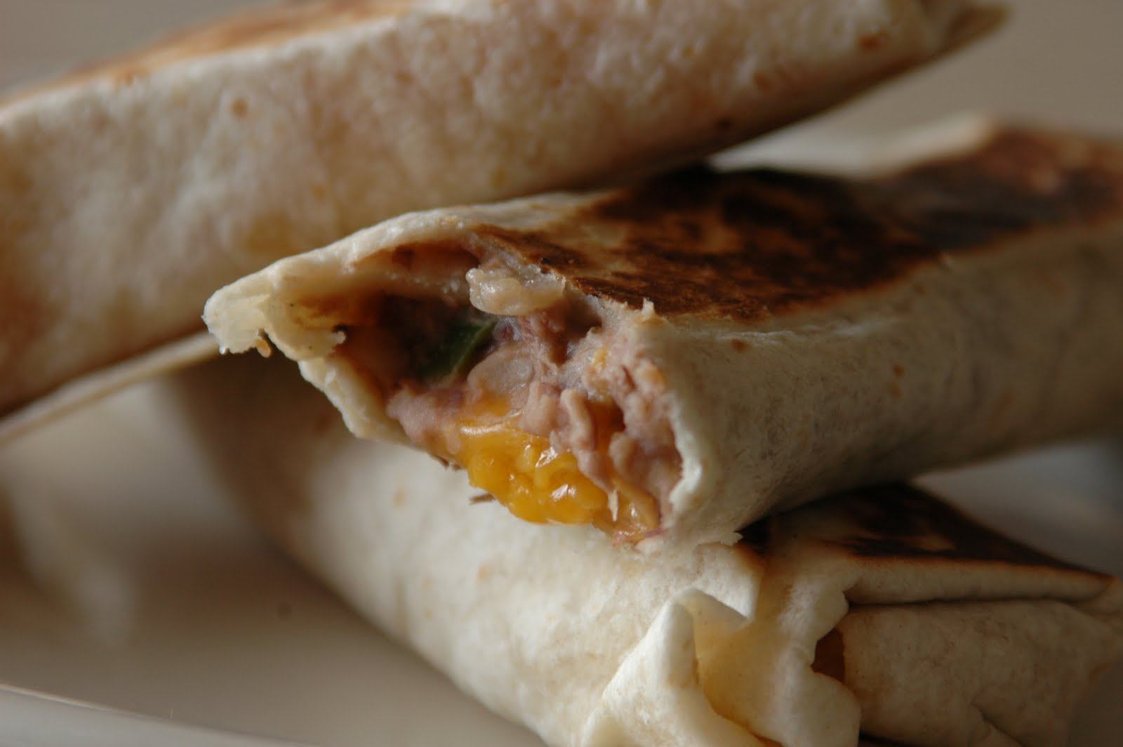 Put some beans and shredded cheese into a flour tortilla and microwave it for a minute or two to get the beans warm and melt the cheese. Then roll it into a burrito, making sure to tuck the ends in so the cheese can’t run out.