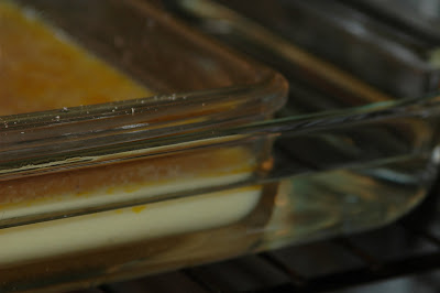 Find a baking dish (a casserole dish, ramekin, glass bowl, or pyrex cake pan would be fine, here) that will fit completely inside a larger high-sided pan. Place the smaller pan inside the larger pan: there should be space on all 4 sides. You’ll be filling this space with water once the pans are in the oven (making a water bath for the custard ensures that it comes up to temperature more slowly and the heat is distributed evenly, preventing the eggs from seizing and becoming grainy or rubbery).