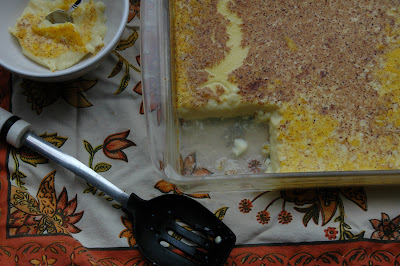 Bake this for about 30 minutes, or until a toothpick or knife inserted into the center of the custard comes out clean (it will seem wet, but there will be no egg on it).