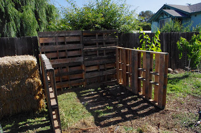 I figured that I needed about 10 pallets. Starting out with 2 on the right side and 2 on the left side, 4 for the back side and 2 more on the front. By using old scrap 2 x 4’s cut into 1 foot piece’s that I found in the yard I then attached the pallets together along the inside framing. Then I attach the sides to the back wall, then to the front.