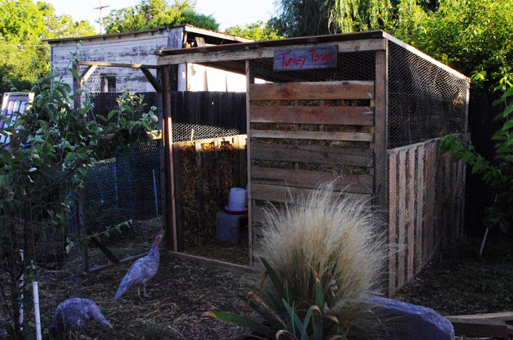Then they started to get big so we had to come up with some kind of housing. That’s where Turkey Town comes in. I started to think about what type of housing to build that cost the least. The first thing that I thought of was a big shipping crate. I found one behind a wine shipping business and asked them if they were planning on keeping it. Unfortunately for us they were. The second option was to build one from the ground up. Too costly and we try to avoid using new materials whenever possible.