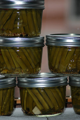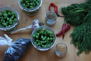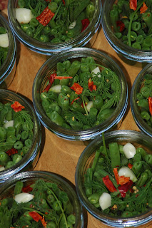 Cut the beans into spears that will fit standing upright in the wide-mouthed jar of your choosing (which you have sanitized according to the national guidelines, right?). Pack them rather snugly into the jars, making sure to wedge down a few large stems of dill and some garlic and pepper pieces while you are packing (divide up the dill, garlic, and peppers so that each jar gets the same amount) . Fill the jar as tightly as possible to ensure the best results.