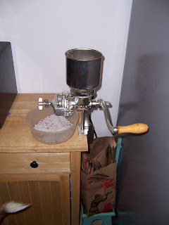 Once the corn is no longer wet you can run it through the mill. We own an electric mill, but in our move we misplaced it so we went to buy a hand crank one. We first bought a Shule Mill from a Kitchen Supply Store. It was the only mill they had. An hour later and after only producing 1/2 a cup of course flour I was done! It was incredibly inefficient. That one will be returned this week. We then went to Beer, Beer & More Beer and purchased a Victoria Grain Mill. What a difference! In 30 minutes we had run 8 cups of flour through 3 times.