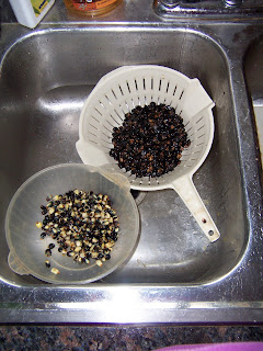 3. Strain Nixtamel in colander and rinse. Roll kernels in hands to remove excess loose skins. Our corn came out of the alkaline solution almost black, and once the skins were removed they were a rainbow of colors.