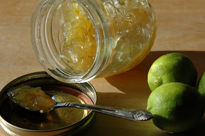 I took the intermediate step of placing the inner membranes and seeds in a cheesecloth bag and simmering it with the juice/flesh mix. After about 30-40 min. I take the bag out, cool it and then squeeze it to milk pectin from the contents, then discard it, return the pectin to the mix, add the sugar and cook until done. This is pretty much what June Taylor does. I must say my back was pretty sore after cutting up 36 of those little limes. I ended up with about 3 cups of juice and flesh (not counting the inner membranes). I'll let you know how this turns out, but there's a good reason you don't find this stuff for sale. It's impossible to ask enough to justify the labor!
