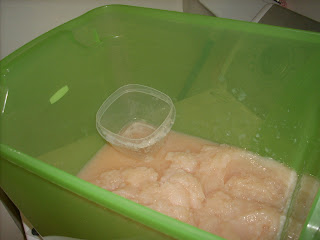 * A really big container with a lid (it has to be big enough to hold at least two gallons of water. I use a large Tupperware style container I had around the house. A kitty litter plastic box would work. I like to keep the bulk of it in the box and fill up an empty detergent bottle with what I will use.)