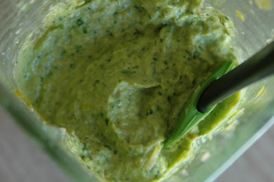 Transfer the softened leeks into a blender or a food processor (my blender does a better job of pureeing than my cuisinart) along with most of the arugula (save a little bit to chop for garnish) and the raw egg. Blend until the sauce is thick and a bit foamy. Add a tiny bit of water if the arugula won’t blend down on its own.