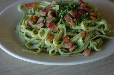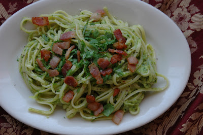 The pasta was PERFECT with this sauce. The sweet, mellow flavor of the long-cooked leeks and garlic blended with the salty crispness of the bacon and the crunch of the raw arugula and the rich heartiness of the egg to make something greater than I could have imagined.
