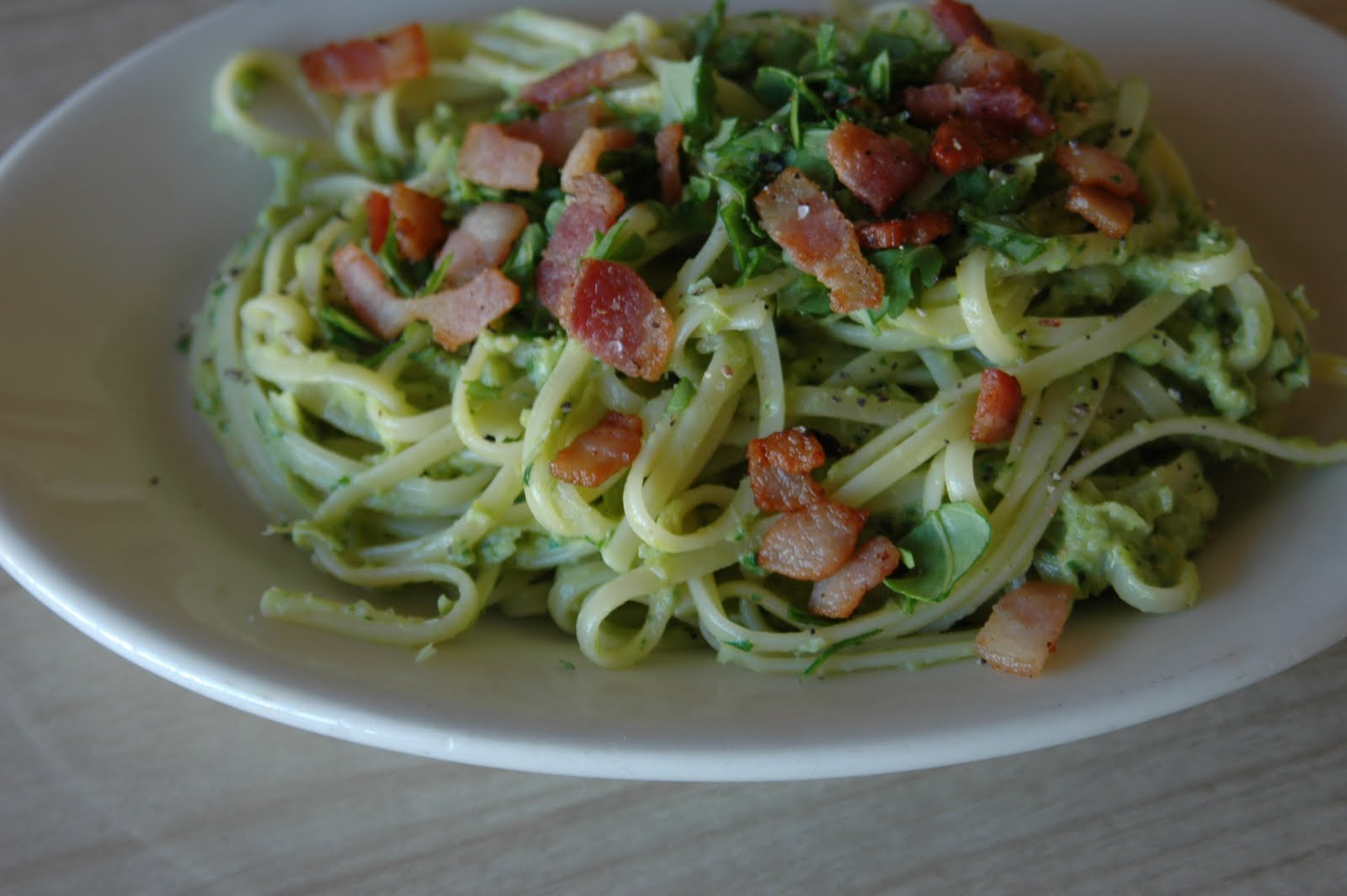 Serve this pasta on a large serving plate (or individual bowls) with a sprinkle of chopped arugula, some bacon bits, and fresh cracked pepper and salt.