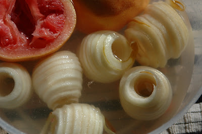 Peel and core the pears, and dice the fruit into small chunks. If you are not using the pears right away, leave them soaking in a nice bath of citrus juice and water so they do not oxidize and become unsightly. I used my handy-dandy apple peeler-corer-slicer for this bunch of pears, and then just cut the rings into bits – easy as pie. Mmmmm, pie.