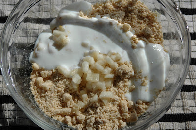 Meanwhile, in a large bowl, sift together the flours, salt, baking powder, and dry spices. Add the sugar and ginger, then the butter, using your hands (or a pastry cutter if you are squeamish) to rub the flour into the butter until the whole mass is consistently crumbly.
