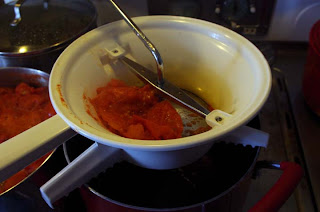 Adding cooked tomatoes to the food mill to remove skins and seeds |
