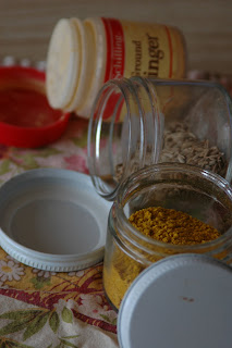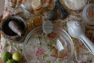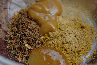 To make the dressing, grind the hot pepper and cumin together (I use a mortar and pestle, but a spice grinder would be OK too). Transfer the crushed cumin/pepper into a small bowl (at least 1 cup capacity). Add the curry powder, ginger, mustard, and honey. Squeeze in the lime juice (make sure to strain out the seeds), and whisk everything together until smooth. Slowly drizzle in the oil, whisking constantly until the dressing is homogeneous and fully emulsified.