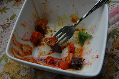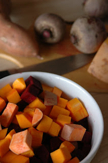 The first time I made this salad (yesterday), I just used some pre-baked sweet potatoes that were sitting in the fridge, and made a dressing for them. You can see in the images I’ve taken that my second go-round was a little more complicated than that. Really, you can use any root vegetables/squashes in this, and it will be tasty. I bet eggplant or zucchini would be awesome, too. When you roast veggies like this, make a LOT. Like, WAY more than I say in the recipe.