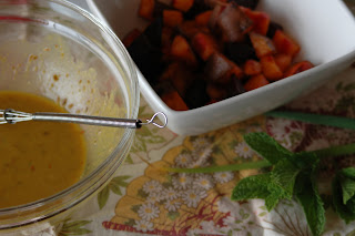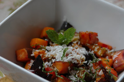 At this point, taste the dressing. Add more honey or more lime juice as necessary to balance the flavors (remember that the root roast will be fairly sweet). Pour the dressing over the cooled root vegetables, and toss to coat. Sprinkle the salad with the coconut and mint, and serve.