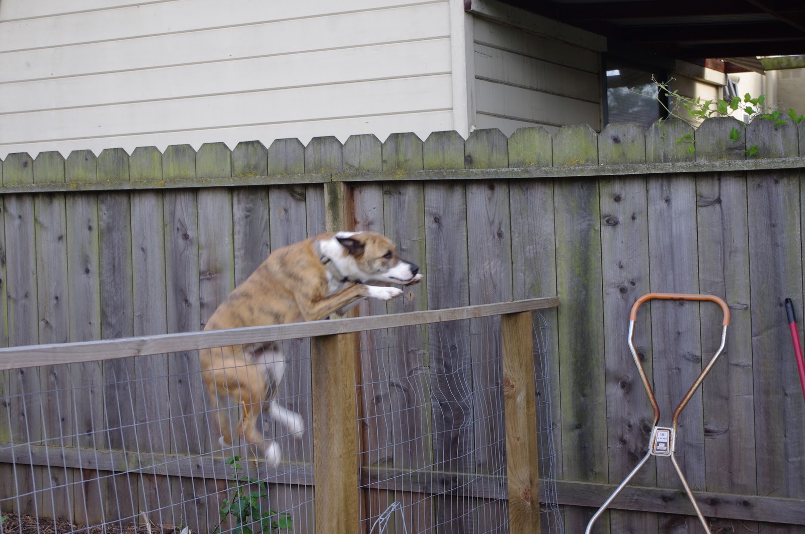 We didn’t want the dogs running through our garden so we installed a 4′ high fence dividing the yard. We should have known better. While it works well keeping Riley out – lazy dog won’t jump higher than the couch – it does nothing to stop Squeek. She learned early on how to jump it. Now it’s barely an obstacle for her. If we’re in the garden, she’ll jump it. If she has to do her business, she’ll jump it. If there are squirrels, of course, she’ll jump it.