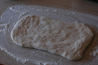 When the dough has completely risen, turn it back out onto a floured surface. Pressing all the air bubbles out as you go, roll the dough into a rectangle roughly 9″ x 18″.