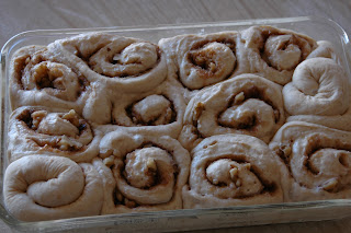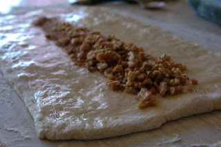 Starting on one of the long sides of the rectangle, roll the dough into a long log – don’t press too hard, or the nuts will cut through the dough. Slice rounds off of the log, and place them into a greased cake pan (the original recipe said it made 18 rolls, but they always seemed a little small. I like making about a dozen, and smooshing them into a 9″x13″ pyrex casserole dish that’s been rubbed with butter).