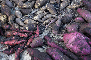 The days are getting shorter and the nights colder. As we quickly approach our average first frost date I realize that it’s time to pull out our sweet potatoes. Because of late rains all over the U.S. we didn’t receive our slips until late June, giving them a rather short season. As usual, most of the garden had been planted leaving very little space for the sweet potatoes.