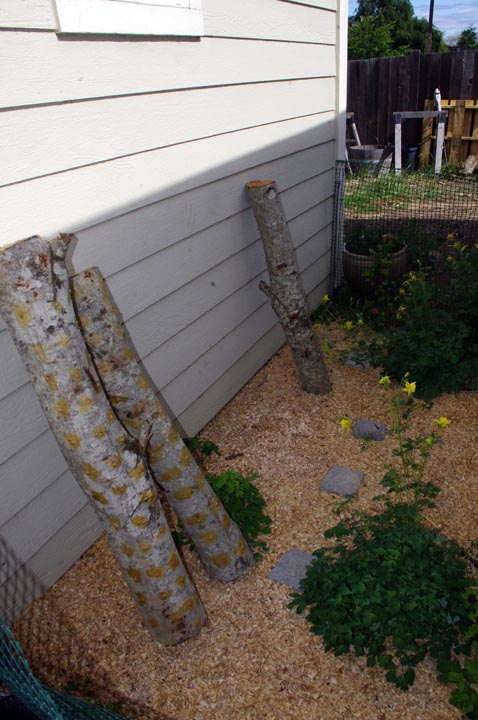 Most of the chips available around here are redwood, pine or eucalyptus – all of which are not appropriate due to the oils in the wood. We had to get creative. As luck would have it, when we got Lucy’s new digs, we were also given some animal bedding. The majority of animal bedding is made from pine, but this bedding was Aspen – a hardwood. It was a small amount, not enough to do the bed, so we needed to find more. We were finally able to find large bales of Aspen bedding at a chain pet store.