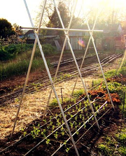 1. Trellises – Tom works for an electrical supply company. They usually end up throwing out all sorts of items that are damaged, including dented 1/2″ conduit pipe. It’s galvanized to keep it from rusting and it makes great stakes and tepee type trellises. We use nylon contractor’s string to keep it together because it doesn’t break down like twine and you can use it year after year. Get in contact with a local electrical company and see if they are willing to give you their bent or dented conduit. You can also use PVC irrigation pipe, but if it’s white, just realize that it will eventually break down with UV exposure (ending up in the landfill) and that it should NEVER be burned (it releases dioxin, a highly toxic compound). We also use old metal railings that a friend took off of their porch to replace.